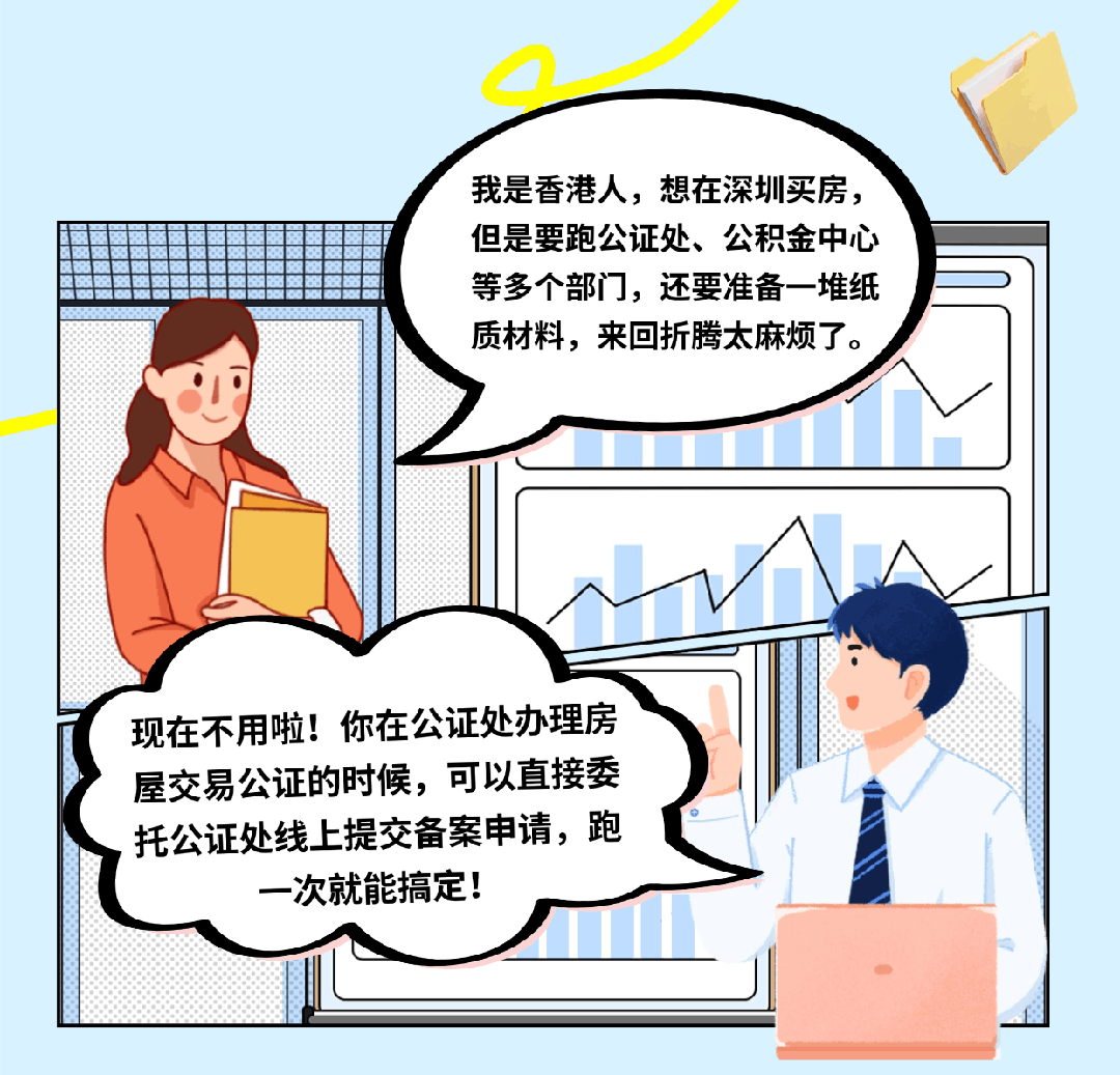 近日,深圳市公积金中心联合前海公证处推出房屋交易“合同公证+备案”联办服务,港澳台居民、外籍人士在深买卖房屋,在公证部门办理公证手续时,可直接委托公证部门线上提交备案申请,一次跑腿就能办成两件事。